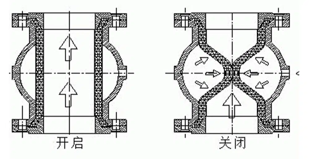 在控制介质未输入时,胶套和阀体之间的空腔与大气连通,胶套受流体压力处于向外张紧状态。因为管套内有一定角度排列的增强帘布层,使管套轴向和径向压力相互平衡,所以管套的长度与直径不会因为流体压力而变化。当控制介质进入管套与阀体之间的空腔时,管套在介质压力下变形截流。如下图所示:
