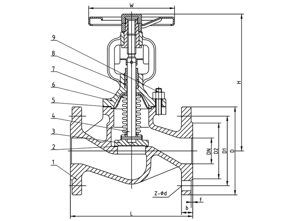 DN | L | D | D1 | D2 | b | f | W | H | z-∅d |