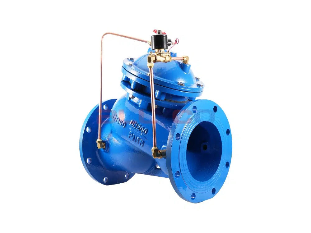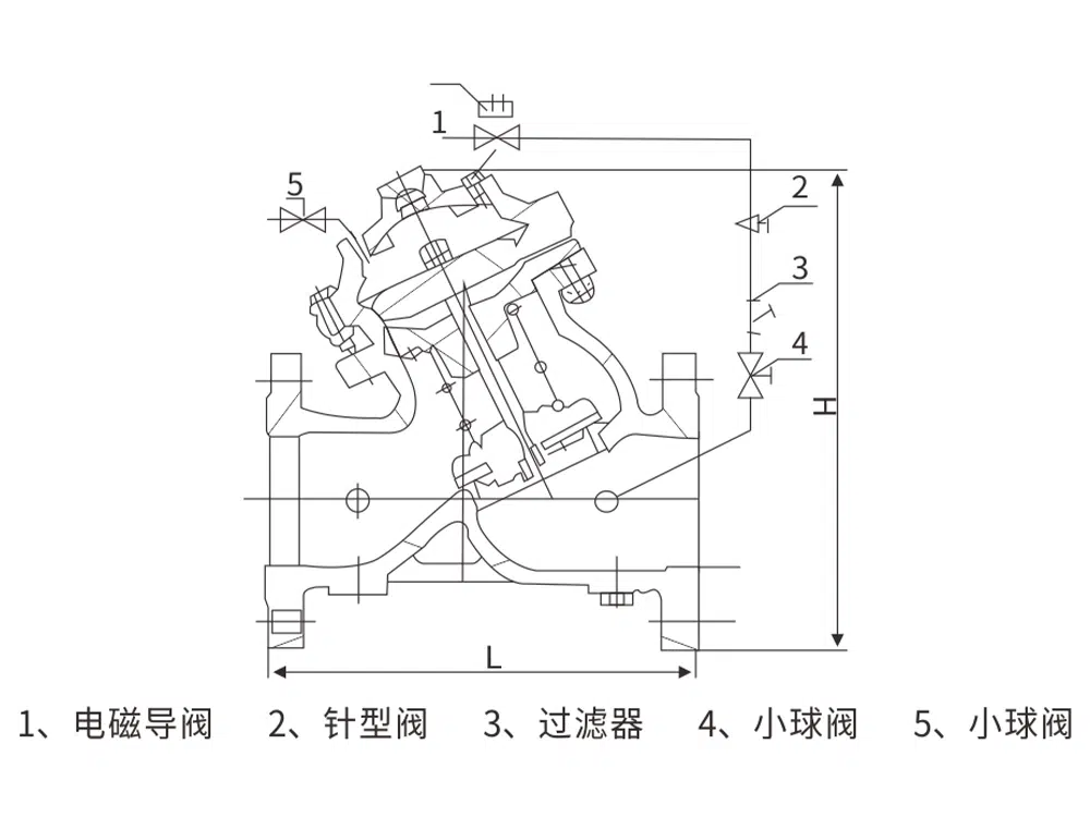 J145X隔膜式电动遥控阀由主阀和调节阀及接管系统组成,阀体采用直流式阀体,主阀控制室为膜片式或活塞式的双控制室结构,控制室比一般水力控制阀增加了一个,增加了对主阀的控制功能,实现了对水泵出口的缓慢开启、全开、缓闭、截止等多功能控制,实现了一个阀门、一次调节对水泵出口的多功能控制。