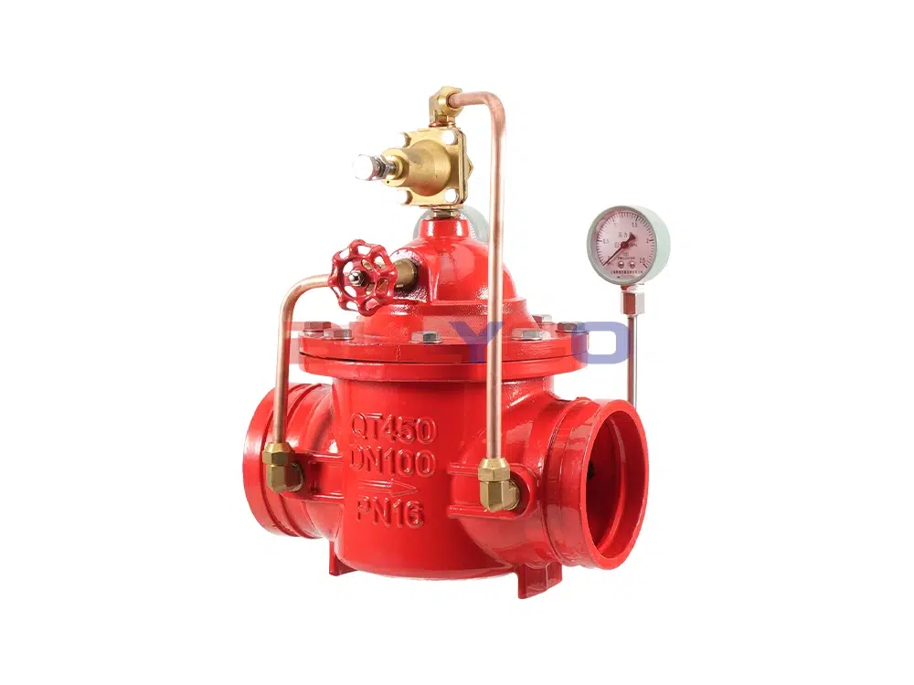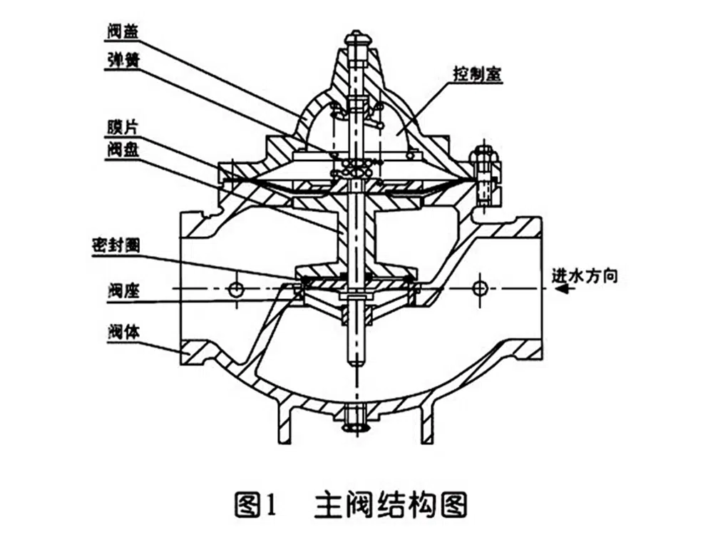 当阀门从进口端给水时,水流过针阀进入主阀控制室,出口压力通过导管作用到导阀上。当出口压力高于导阀弹簧设定值时,导阀关闭。控制室停止排水,此时主阀控制室内压力升高并关闭主阀,出口压力不再升高。当阀门出口压力降到导阀弹簧设定压力时,导阀开启,控制室向下游排水。由于导阀系统排水量大于针阀的进水量,主阀控制室压力下降。进口压力使主阀开启。在稳定状态下,控制室进水、排水相同,主阀开度不变,出口压力稳定。