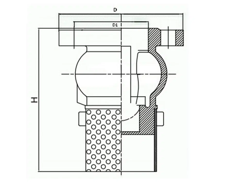 H42X滤网式底阀是一种节约能源的阀门,一般安装在水泵水下吸管的底端限制水泵管内液体返回水源,起着只进不出的功能。底阀由阀体,阀瓣,阀盖,衬套,密封圈等零件组成,在流体的压力作用下,阀瓣打开水,当示停后出口管内的压力将阀瓣迅速关闭,液体将不会倒回水源,起到了即畅通抽水又节约水能损失的作用。