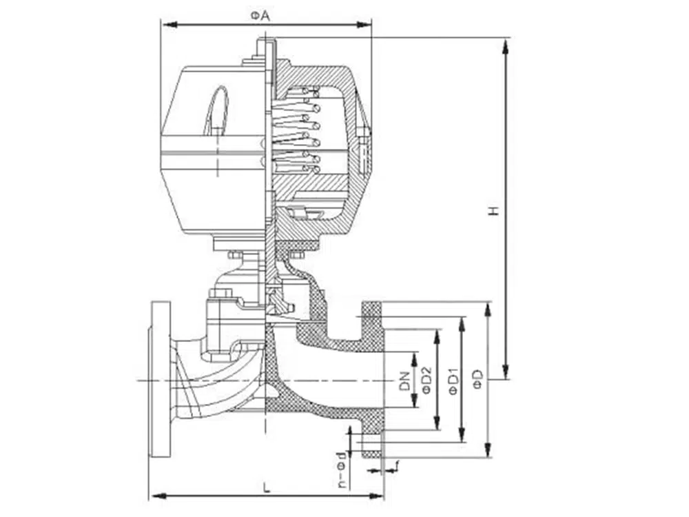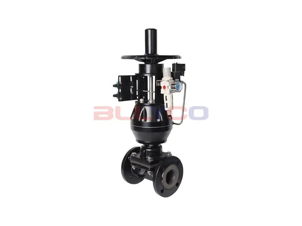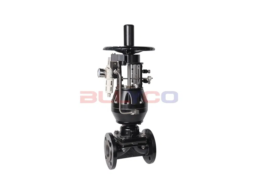 The valve closes when pressurized and opens when depressurized. Opening and closing are achieved by the pneumatic actuator driving the valve stem's vertical movement. When the valve stem is in the upper position, the spherical diaphragm bends upward, forming a conductive state. When the valve stem moves downward, it drives the valve plug to bend the diaphragm, forcing it to tightly seal against the valve seat area, thereby closing the pipeline fluid passage.