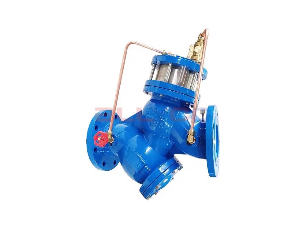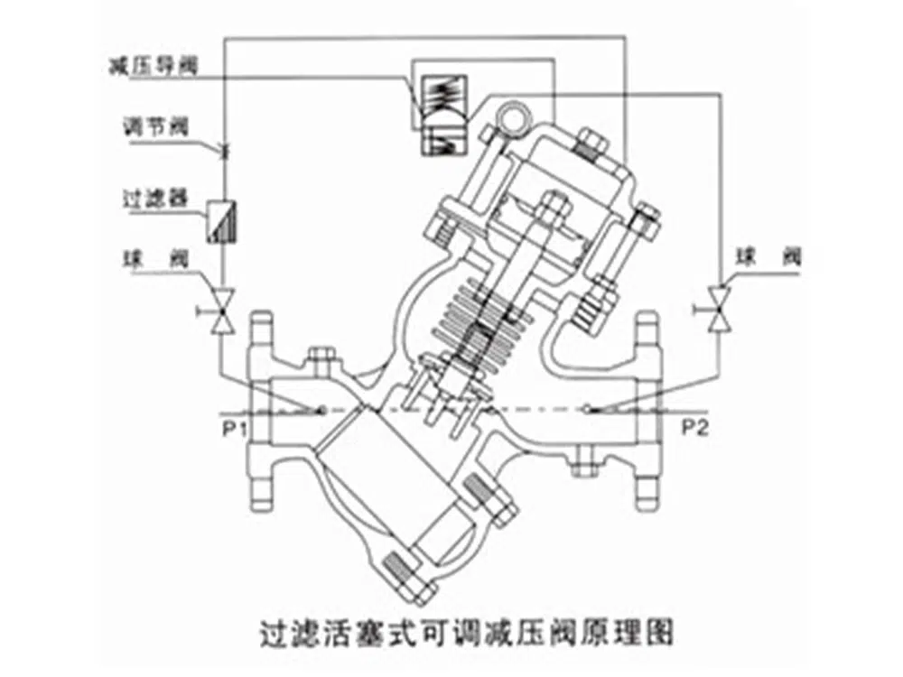 The YQ98001 filter piston-type adjustable pressure reducing valve transmits differential pressure signals via a Pitot tube to the pilot valve, flow control valve, and needle valve to execute dual-path control. This regulates the pressure in the upper chamber of the main valve piston. Adjustment of the stacking pin through the flow control pilot valve ensures the downstream flow reaches the set value. The lower chamber of the piston communicates with the downstream via a throttle orifice. The valve closes when pressure drops. The pressure differential across the main valve serves as the driving force for valve operation. Primarily used in air conditioning, water supply and drainage, fire protection, and various industrial and mining enterprises where water supply networks require filtration and flow control. It reduces upstream pressure to the preset downstream pressure, maintaining the set downstream pressure regardless of changes in upstream pressure or flow.
