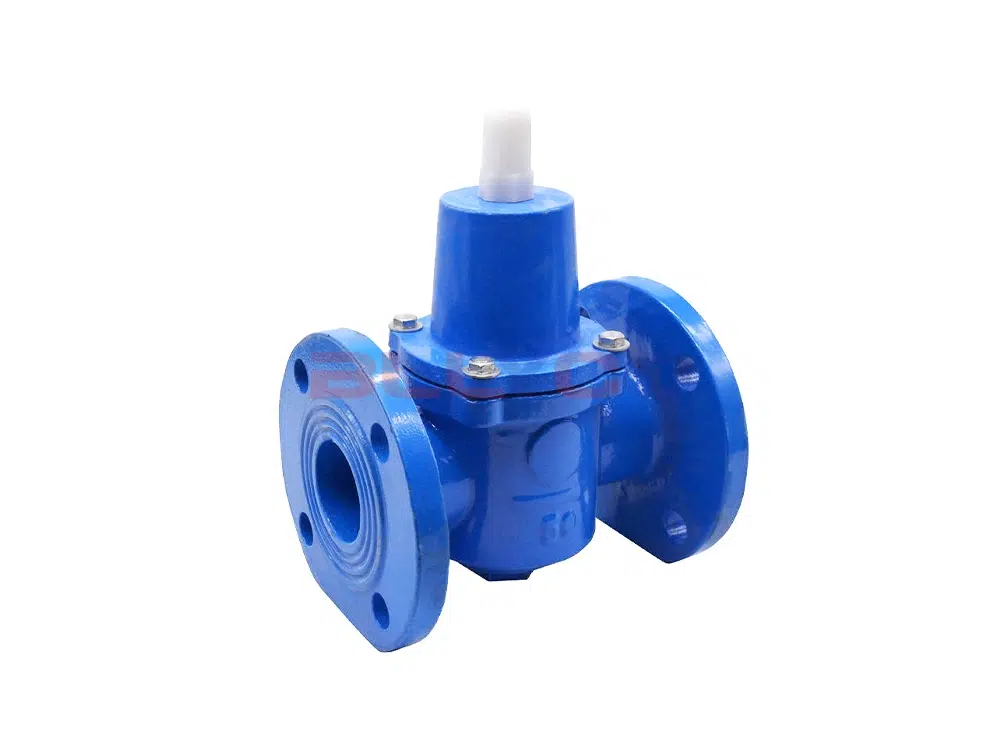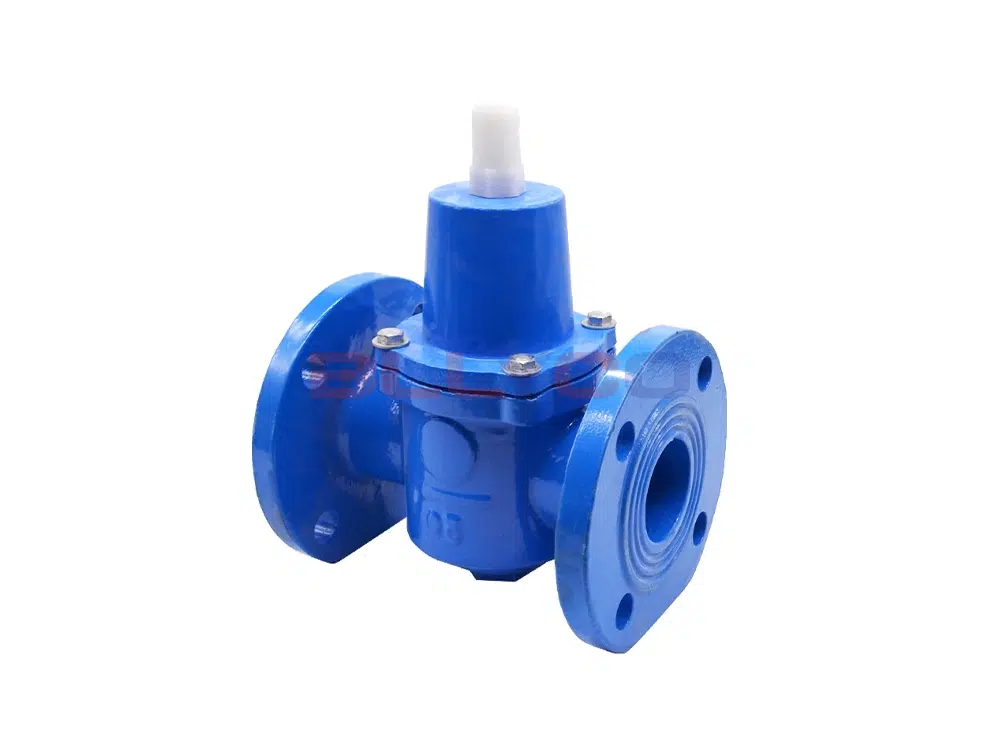 The valve valve outlet pressure through the pressure feedback mechanism to the rubber diaphragm under the spool, so that the valve flap and the cut-off port to maintain the corresponding position, when the adjusting value, the cut-off port closed to realize the reduction of static pressure, when the pressure after the valve is lower than the adjusting value, by the pressure of the spring downward pressure on the spool, and then open the cut-off port for boosting, to ensure that the pressure after the valve does not exceed the adjusting value. As the inlet pressure surface and outlet pressure surface is 1:10, the force of 0.1MPa after the valve can balance the force of 1.0MPa before the valve, so it has the role of pressure stabilization.
