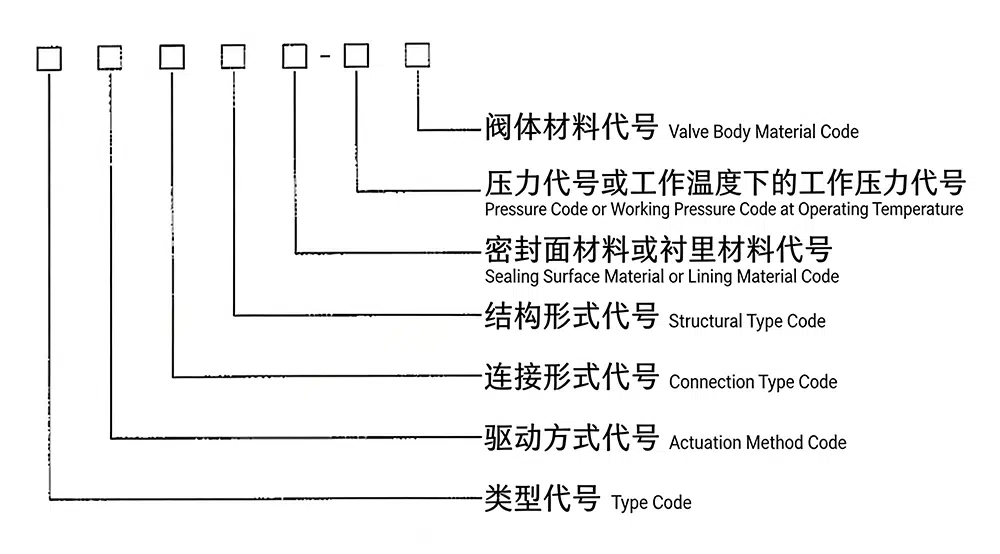 Valve model designations are composed of codes representing valve type, actuation method, connection type, structural configuration, sealing surface material or lining material type, pressure rating or working pressure at operating temperature, and valve body material.