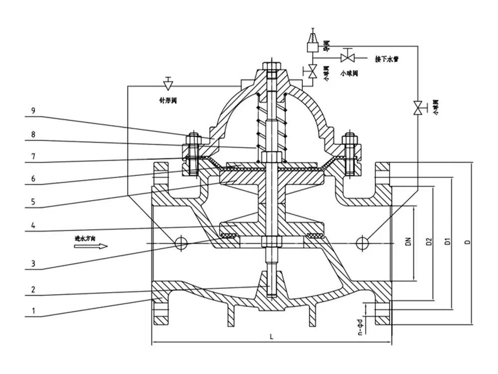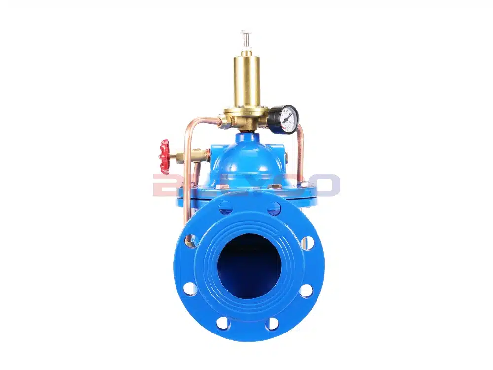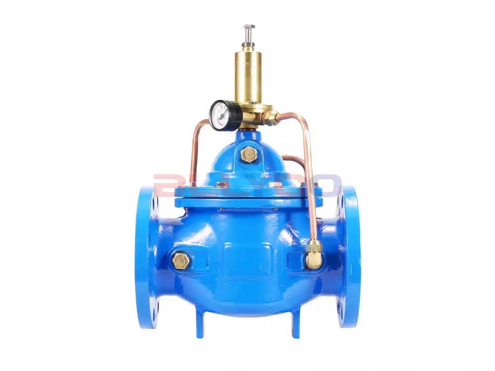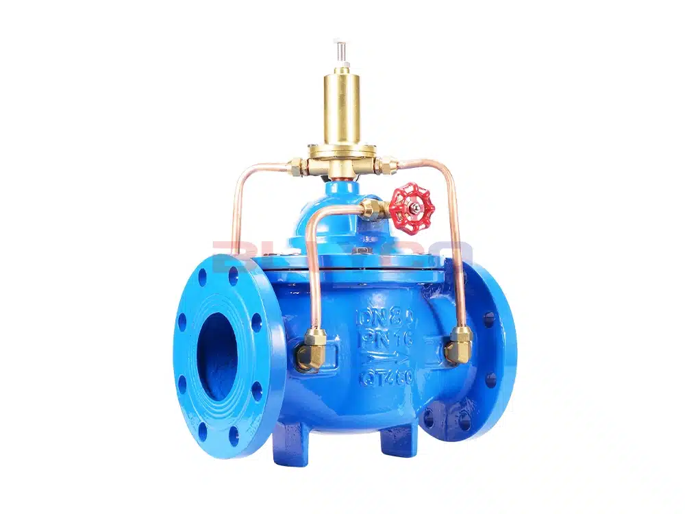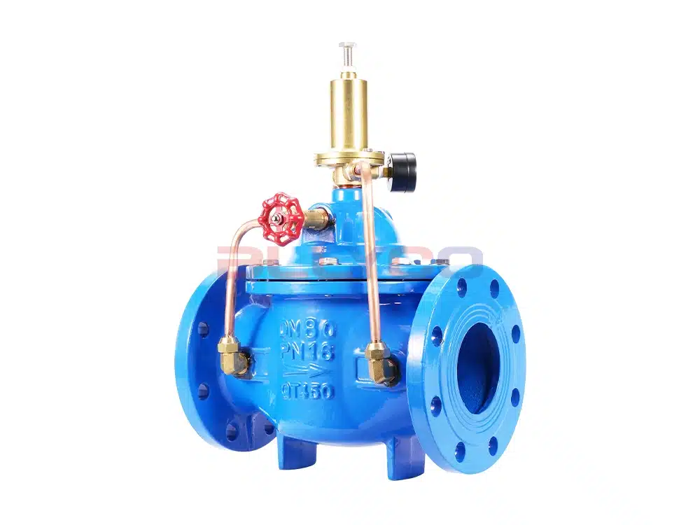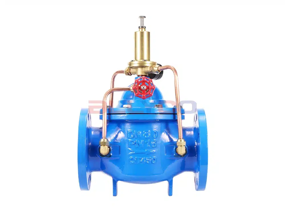 500X pressure relief valve is used in fire fighting or other water supply system to prevent the system from overpressure or maintain the pressure of fire fighting water supply system, after the fire fighting pump is shut down, it can also reduce the impact of water hammer, and is also used for large water supply system water hammer device. 500X pressure relief valve consists of main valve, relief valve, pressure holding pilot valve needle valve, ball valves, microfilter and pressure gauge to form a hydrodynamic control system of the takeover. Using hydraulic automatic operation, that can be used as a pressure relief valve and can be used as a pressure holding valve. As a pressure relief valve, can maintain the water supply pressure in the set safety value; do hold pressure valve, can maintain the main valve upstream of the water pressure in the set value above, to maintain the main valve upstream of the water supply pressure; this product utilizes the hydraulic self-control, do not need other devices and energy, easy maintenance, a valve for multiple uses; this series of valves are widely used in high-rise buildings, living areas, such as water supply pipeline network systems and urban water supply projects.