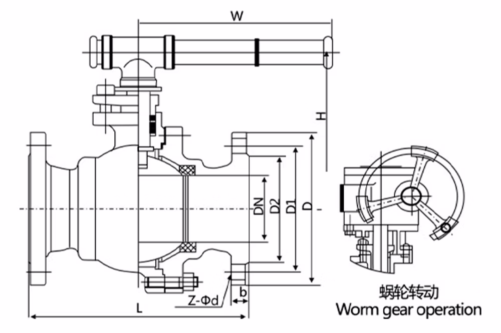Q341F-16C cast steel worm gear flange ball valve is one kind of manual drive system device, the top is equipped with an opening degree indication disk, which can accurately indicate the opening angle of the ball valve. It is mainly used to play the role of cutting off the medium in the pipeline, and has the function of manually adjusting the flow of medium.