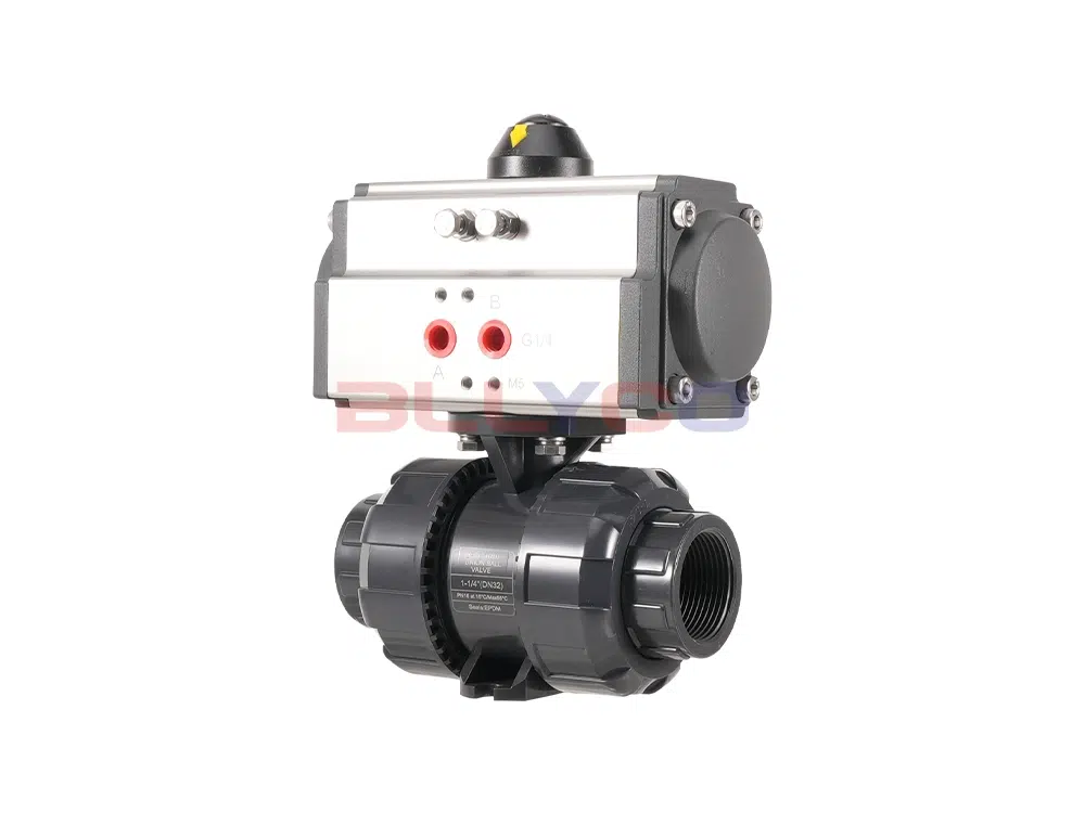 UPVC气动双由令球阀重量轻、耐腐蚀性强,被用于多个领域,如生活饮用水系统、海水淡化、污水系统、酸碱及常规化学溶液系统等多个行业。UPVC气动双由令球阀采用双由令连接(丝口内螺纹、粘胶承插),不需要特殊工具即可快速装配,具有结构紧凑、耐腐蚀、耐腐蚀、容易拆卸、方便维修、使用寿命长等诸多优点。