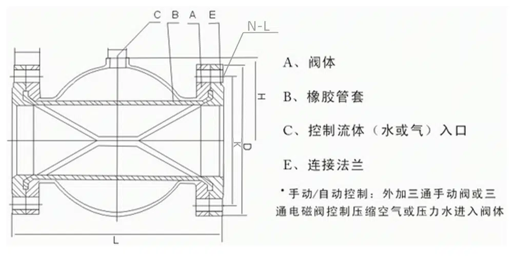 เมื่อไม่มีการนำตัวกลางควบคุมเข้าไป ช่องว่างระหว่างปลอกยางกับตัววาล์วจะเปิดโล่งสู่บรรยากาศ และปลอกยางจะถูกดึงออกด้านนอกด้วยแรงดันของของไหล เนื่องจากมีชั้นผ้าเสริมแรงที่จัดวางในมุมที่กำหนดภายในปลอกยาง แรงดันตามแนวแกนและแนวรัศมีจึงสมดุลกัน ทำให้ความยาวและเส้นผ่านศูนย์กลางของปลอกยางไม่เปลี่ยนแปลงภายใต้แรงดันของของไหล เมื่อมีการนำตัวกลางควบคุมเข้าสู่ช่องว่างระหว่างปลอกยางกับตัววาล์ว ปลอกยางจะเปลี่ยนรูปภายใต้แรงดันของตัวกลางเพื่อจำกัดการไหลของของไหลดังแสดงด้านล่าง: