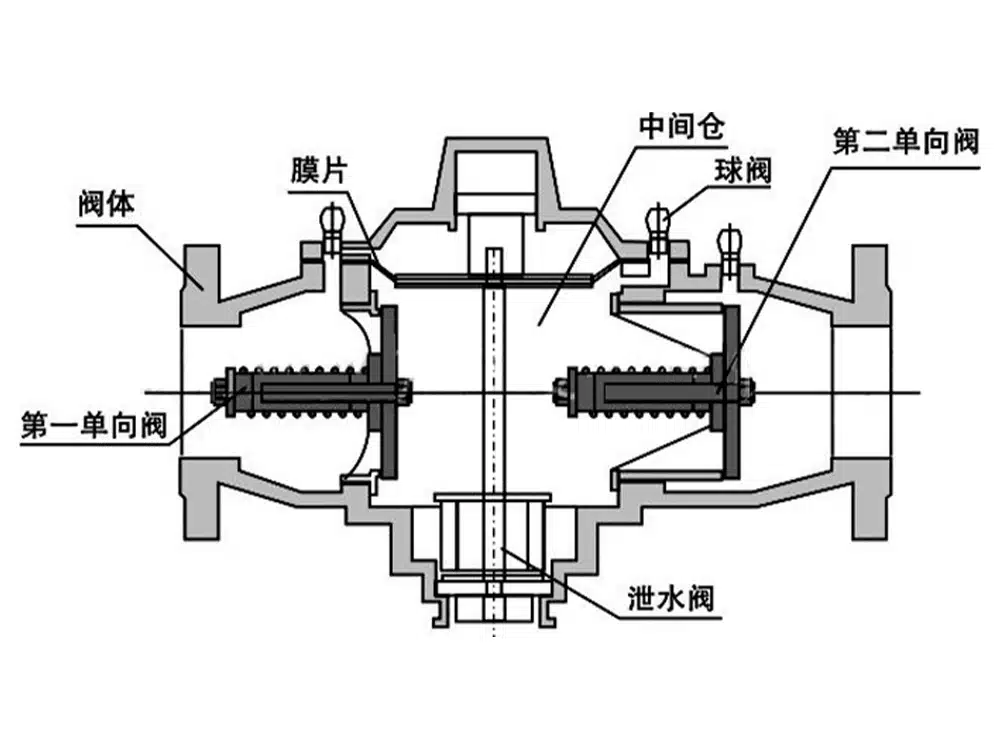 ตัวป้องกันการไหลย้อนทำงานตามหลักการที่ว่าเมื่อมีสื่อไหลผ่านวาล์วตรวจสอบทางเข้า จะเกิดการลดแรงดันเนื่องจากแรงต้านทางกลและการสูญเสียความสูงจากการล้น ซึ่งจะทำให้แรงดันที่ทางเข้าสูงกว่าแรงดันภายในห้องวาล์วระบาย แรงดันเหนือไดอะแฟรมของวาล์วระบายจะเท่ากับแรงดันที่ทางเข้าแรงดันนี้สูงกว่าทั้งแรงดันในห้องวาล์วปล่อยและแรงต้านของสปริง ทำให้วาล์วปิดอยู่และรักษาการไหลตามปกติ เมื่อความแตกต่างของแรงดันระหว่างทางเข้าและห้องวาล์วปล่อยต่ำกว่า 0.02 MPa สื่อจะถึงสภาวะวิกฤตสำหรับการไหลย้อนกลับณ จุดนี้ แรงดันเหนือไดอะแฟรมของวาล์วระบายจะต่ำกว่าแรงดันรวมภายในห้องวาล์วระบายและแรงดันของสปริง ส่งผลให้วาล์วระบายเปิดโดยอัตโนมัติเพื่อระบายสื่อที่ไหลย้อนกลับออกจากท่อ ในขณะเดียวกัน อากาศปริมาณมากจะเข้าสู่ห้องวาล์ว ก่อให้เกิดชั้นอากาศที่ป้องกันไม่ให้สื่อไหลย้อนกลับเพิ่มเติม เมื่อความแตกต่างของแรงดันเกิน 0.02 MPa วาล์วระบายจะปิดโดยอัตโนมัติ