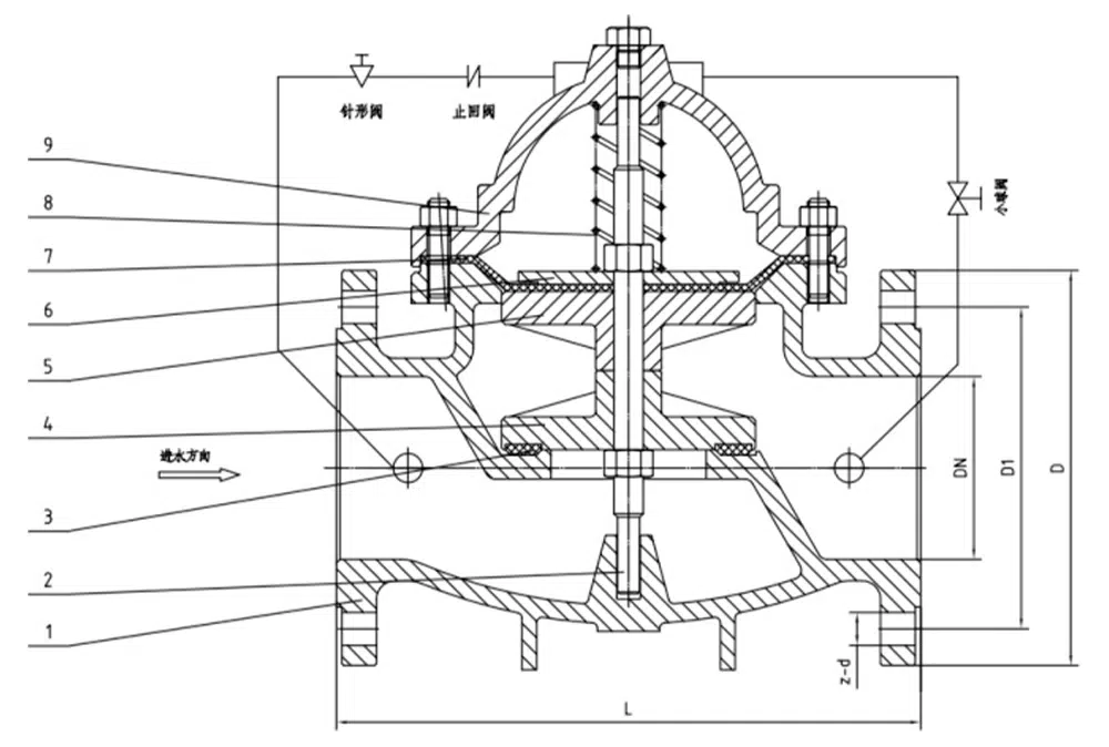 300X yavaş kapanan çek valf, bir hidrolik kontrol alıcı sistemi oluşturmak için ana valf, çek valf, iğne valf, küresel valf, mikro filtre ve basınç göstergesinden oluşur. Hidrolik otomatik çalışma kullanılarak, ana valf hızlı bir şekilde açılabilir veya yavaşça kapatılabilir. Yavaş kapanan susturma etkisini elde etmek için su saati su çarpması oluşumunu önleyin. Yavaş kapanan çek valf giriş ucundan suyu beslediğinde, su mikro filtre, iğne valf, çek valf aracılığıyla ana valf kontrol odasına girer ve ardından küresel valf aracılığıyla aşağı akışa boşalır. İğneli vana açıklığı küresel vana açıklığından daha küçük olduğundan, yani ana vana kontrol odası drenaj oranı su giriş oranından daha büyük olduğundan, kontrol odası basıncı azalır, ana vana diskinin rolü giriş basıncının alt ucunda ana vanayı aşağı akış su kaynağına açmak için. Boru hattı su beslemesini durdurduğunda, aşağı akış suyu geri akmaya başlarsa, geri akış suyunun bir kısmı küresel vanadan ana kontrol odasına, çek valf nedeniyle, geri akış suyu ana kontrol odasından dışarı akamaz, bu da ana kontrol odasının basıncında kademeli bir artışa neden olur ve ana vanayı yavaşça kapatır.